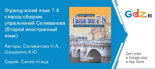 ГДЗ к сборнику упражнений по французскому языку 7-8 классы Селиванова Н.А. (второй иностранный язык) помогает разобраться в сложных моментах. Пособие полностью соответствует всем требования федерального государственного образовательного стандарта основного общего образования.