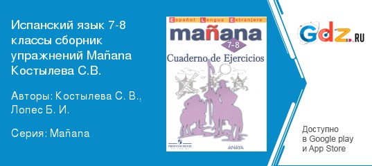 Изучение испанского языка в 7-8 классе считается одним из самых сложных этапов в освоении иностранного языка. Объясняется это тем, что в это время у школьников уже сформирована база знаний, и они стремятся её расширить, а также и расширить словарный запас. ГДЗ к сборнику упражнений по испанскому языку 7-8 класс Manana Костылёва С.В. является отличным помощником в изучении этого непростого, но интересного языка. Пособие полностью соответствует всем требованиям федерального государственного образовательного стандарта основного общего образования.
